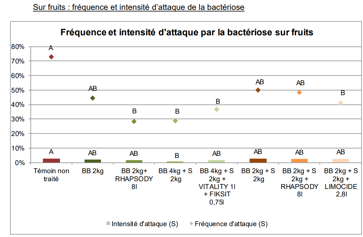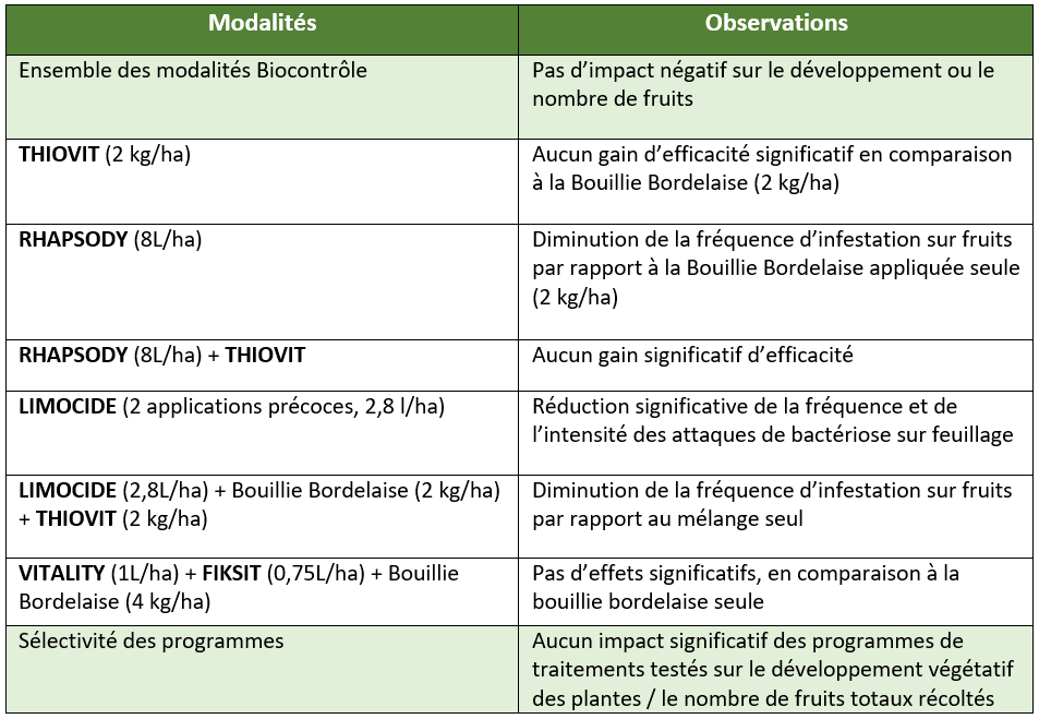 - 3 modalités ont permis de limiter significativement le nombre de fruits touchés, en comparaison au témoin non-traité (Bouillie Bordelaise à 4 Kg, la modalité à base d'huile essentielle d'orange douce (LIMOCIDE) et la modalité à base de Bouillie Bordelaise + Bacillus subtilis (RHAPSODY))